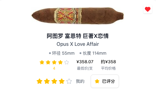 今天测评的是富恩特的巨著常规作品,Love Affair。Love Affair的名称很暧昧,这里翻译为“恋情”,这款雪茄尺寸很小,只有4.5英寸,最大环处是55环,属于普通巨著一档,它在巨著里属于小透明般的存在,要不是巨著这几年火爆,估计在十年前出现的话,也是无人问津的类型。不过,这款雪茄的风味还是可以的,没有给巨著丢脸,甚至可以说比一些其他系列的巨著更适口,除了短一点外,没什么明显缺陷,而且巨著香气足。这款雪茄仍然使用了富恩特多米尼加庄园的原料,茄衣是克罗霍。